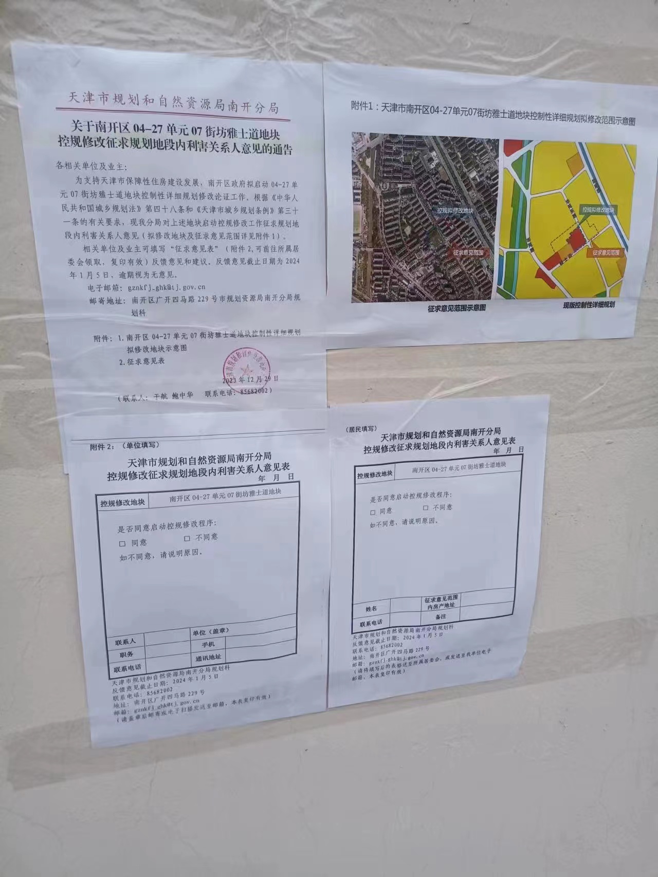 相关负责人您好! 我是华苑天华里小区居民,我坚决反对南开区04-27单元07街坊雅士道地块建设住宅楼。 请相关负责人切实考虑当下华苑路、雅士道早晚高峰的严重拥堵情况、停车位严重不足的情况。 在周边幼儿园、小学、中学资源众多的地块,规划“保障性”高层住房?请设身处地的考虑一下,这将会给这一代居民出行造成何其严重的后果。地段再好,是不是也考虑一下后果呢?请不要再给华苑的居民“添堵”了。 (附公布的规划文件)