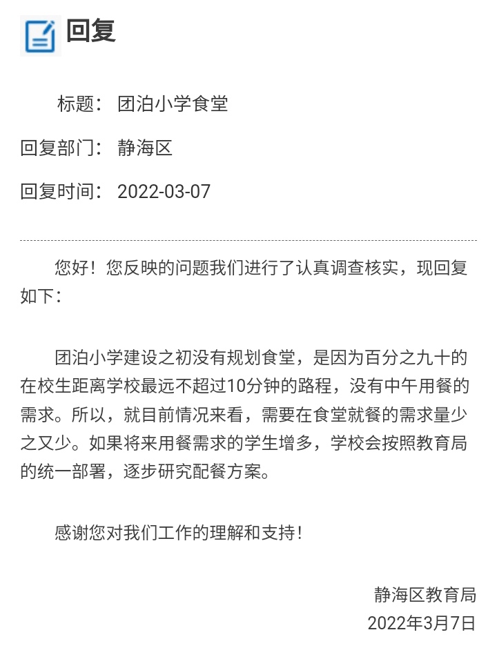 标题:恳请政府在团泊小学开设食堂,减轻上班族父母中午接送