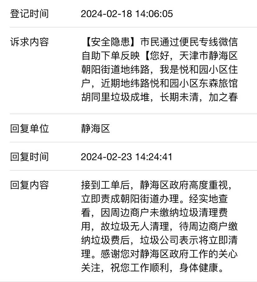 您好,我是平安里社区悦和园小区东森旅馆胡同居民,现因胡同内垃圾成堆,无人处理问题感到困扰。胡同内垃圾春节至今一直未清理,随着气温逐渐升高,垃圾堆异味、消防隐患问题严重影响居住环境。之前12345反应过此问题,社区表示正在沟通协调垃圾清理队,但目前仍没有解决。此外,胡同内商户缴纳垃圾清理费用是否全街道统一要求,是否出台相关规定,不缴费不清理应对举措是否合规,望回复告知。