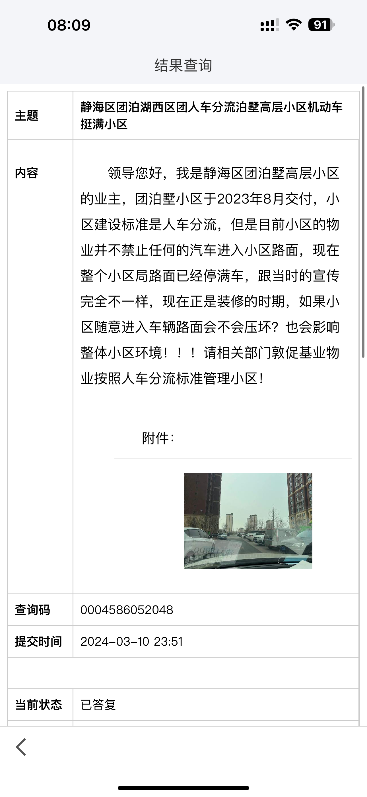 我是团泊墅高层的一名业主,我于2024.3.10反映团泊墅小区物业不安人车分流管理小区的事情得到了静海区康康街道的回复,说会在2024.3月底实行人车分流管理,并且张贴告示,人车分流前小区加强车辆管理,引导居民规范停车;然而现在已经4月11日,小区并没有张贴任何告示,也没有实行人车分流,并且一点没有引导规范停车,消防通道依然被车辆停放,请问主管部门如何处理这件事情