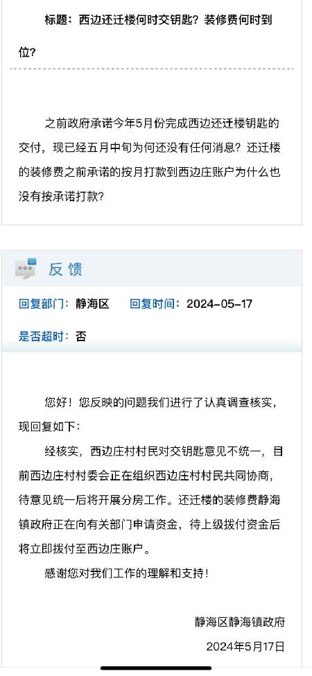 西边庄自2016年拆迁至今已8年有余,政府屡次向后拖延还迁房交付时间。目前,最新定制的还迁方案明确是2024年5月份实施还迁,交钥匙。其中方案经区财政局、土整中心、静海镇政府盖公章签发,并明确装修补偿费分批次支付。可是现在已经是6月份,至今没有任何分房的音讯,没有公示抽签方案、装修费更是分文不提。