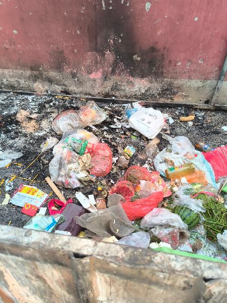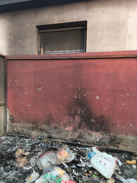 不知道谁点燃了垃圾存放处的垃圾 有难闻的气味,这个肯定致癌啊,且不是第一次燃烧 ,经常有这种情况,墙都熏黑了,