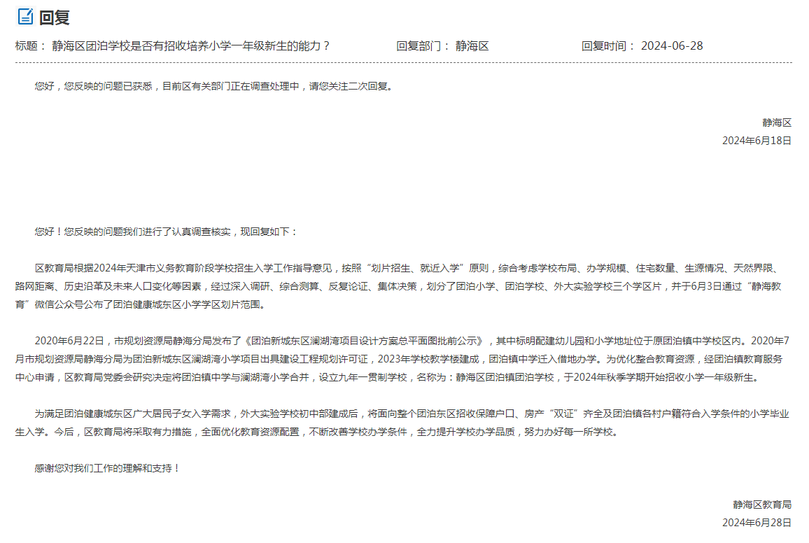 您好!您反映的问题我们进行了认真调查核实,现回复如下: 区教育局高度重视团泊镇团泊学校师资配备工作,将根据团泊镇团泊学校一年级最终招生情况择优选配教师。同时,通过教师交流轮岗、师徒结对、跟岗实践等方式与外大团泊实验学校进行团队共建,不断提升教师的业务能力水平。 感谢您对我们工作的理解和支持!