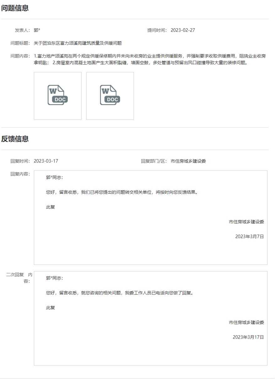 本人于2023年2月进行房屋验收,发现房子多处质量问题,并发现供暖公司在采暖保修期内未进行供暖,违反《商品房销售管理办法》,当时立即向物业、有关部门反馈,并向市住建委投诉。