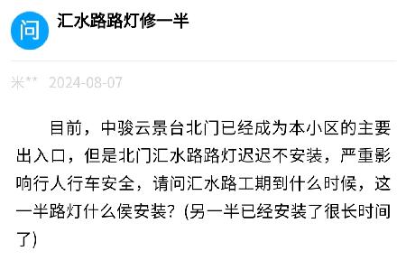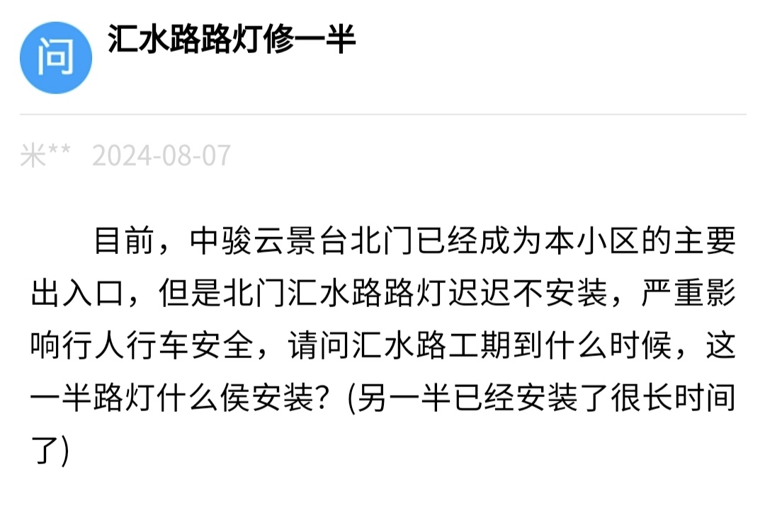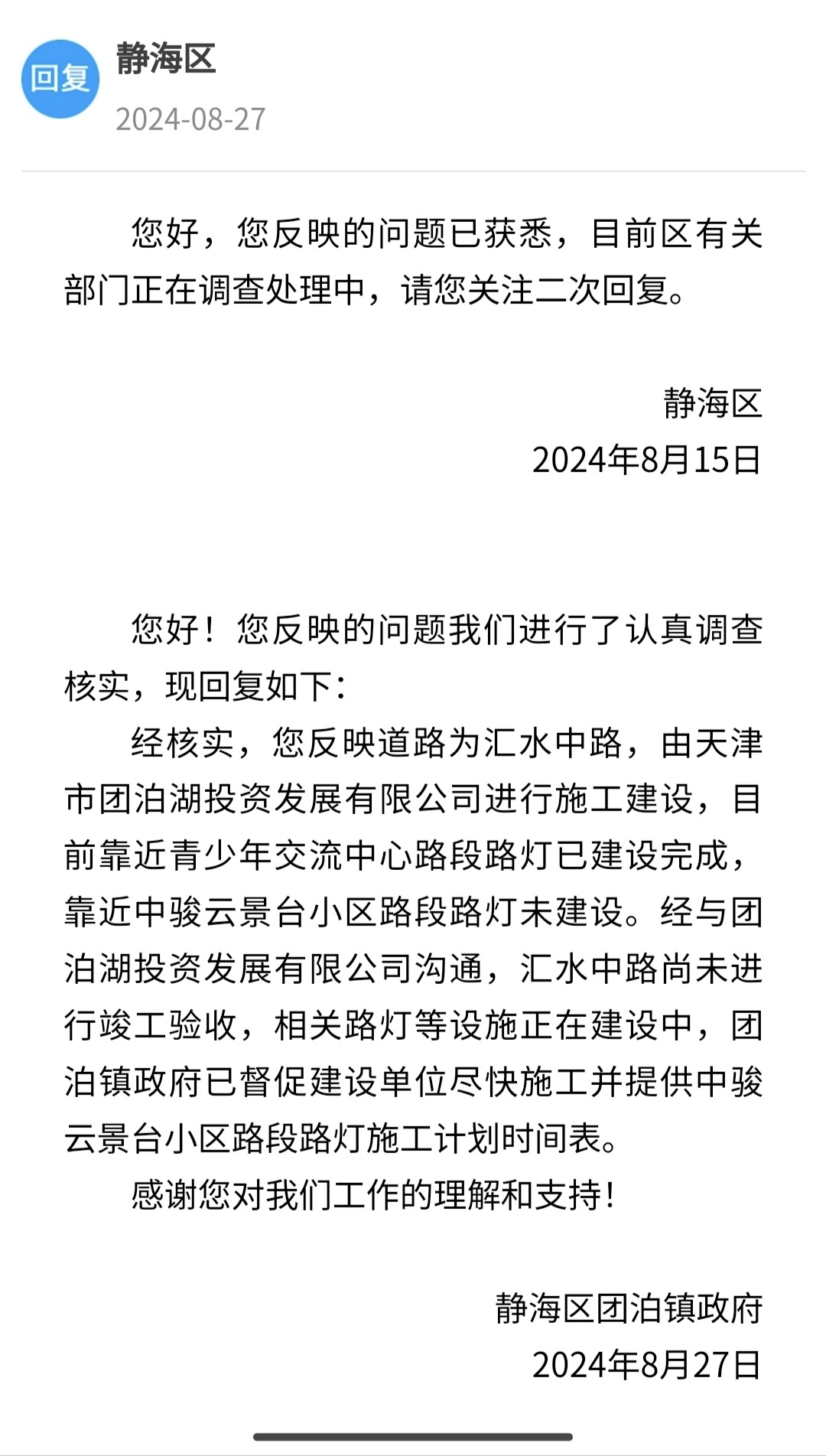 经核实,您反映道路为汇水中路,由天津市团泊湖投资发展有限公司进行施工建设,尚未交付给团泊镇政府。目前靠近青少年交流中心路段路灯已建设完成,靠近中骏云景台小区路段路灯未建设。经与道路建设方沟通,建设方表示汇水中路目前尚未进行竣工验收,相关路灯等设施正在建设中。团泊镇政府已于8月给建设单位去函询问施工计划时间表,目前暂未收到回复。团泊镇政府已再次督促建设单位提供中骏云景台小区路段路灯施工计划时间表。