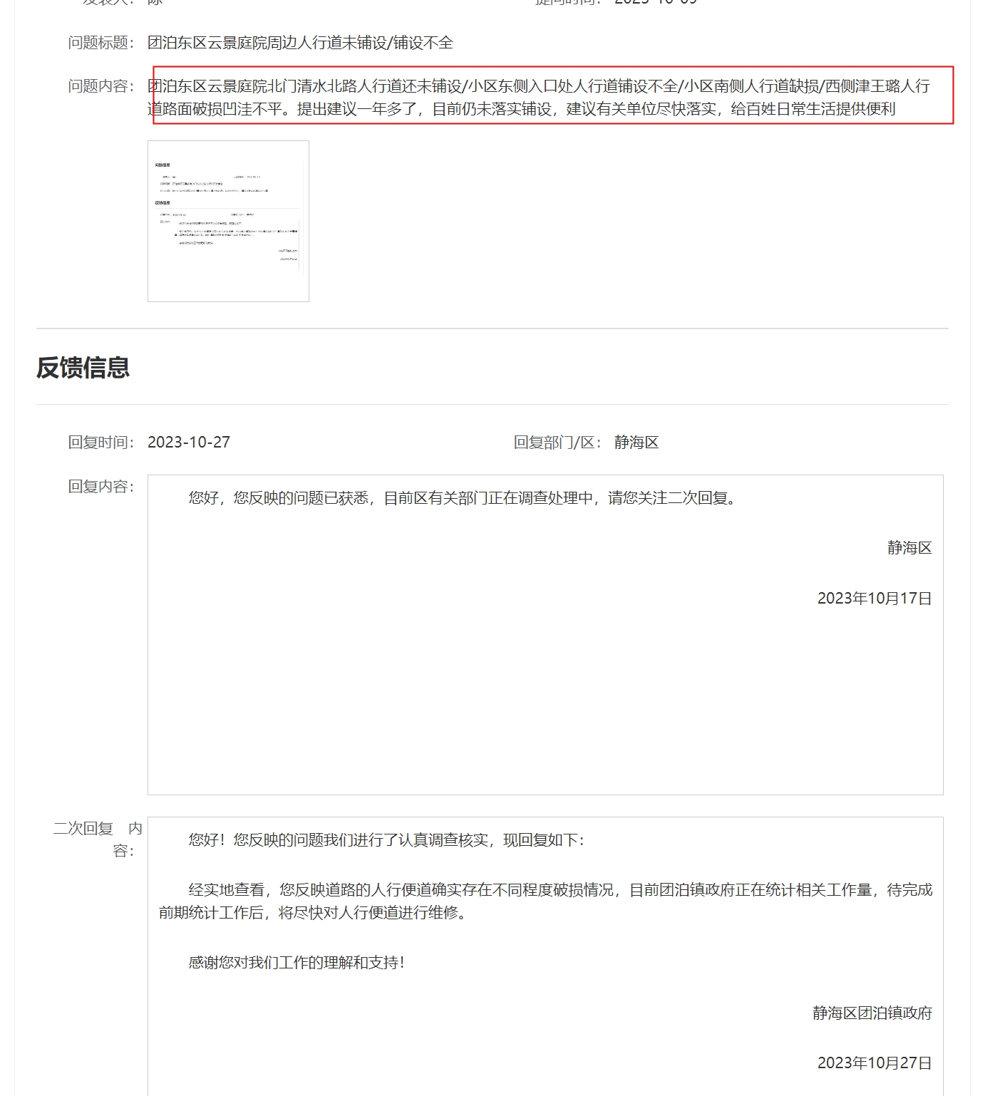 您好!您反映的问题我们进行了认真调查核实,现回复如下: 关于您反映团泊镇云景庭院小区北侧人行道问题,该区域人行道因资金问题暂无修建计划,目前团泊镇政府正在积极筹措资金推动人行道等基础设施建设。 感谢您对我们工作的理解和支持!