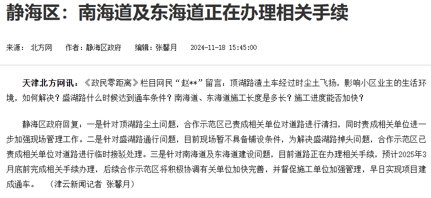 您好!您反映的问题我们进行了认真调查核实,现回复如下: 目前南海道项目相关手续正在办理,经与建设单位、施工单位相关负责人沟通了解,该项目预计2025年5月底完成建设。合作示范区已要求上述单位倒排工期,加快相关手续的办理速度并定期督促,全力推动该项目建设进度。 感谢您对我们工作的理解和支持!