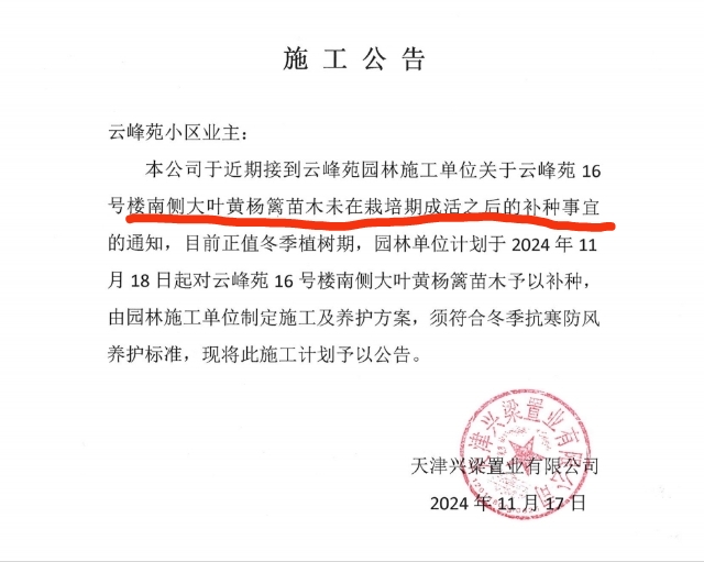 2024年11月16日,本小区16号楼周围有工人铲除绿地,围楼搭建木桩围墙,其他楼业主跟物业反应后叫停,17号地产发给物业一份公告:说是为挡风抗寒给16号楼补种黄杨。18号继续施工。不但种满了2米以上高度的黄杨篱笆,还在篱笆内层加了一层白蜡木围栏,且施工范围由公告说的一侧,增加到三侧,严重影响了小区的整体美感,很多小区业主再找物业反映问题,物业以交房不到两年,他们无权干涉地产行为为由,拒绝阻止施工。