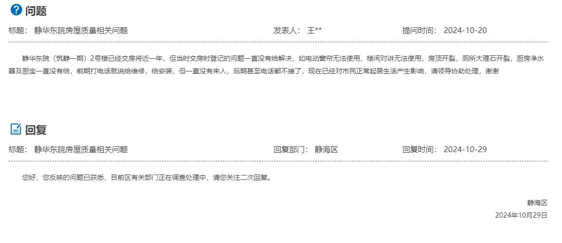 您好!您反映的问题我们进行了认真调查核实,现回复如下: 区住建委已督促开发企业抓紧与您联系并核实现场情况,根据现场情况制定维修方案尽快进行维修。 感谢您对我们工作的理解和支持!