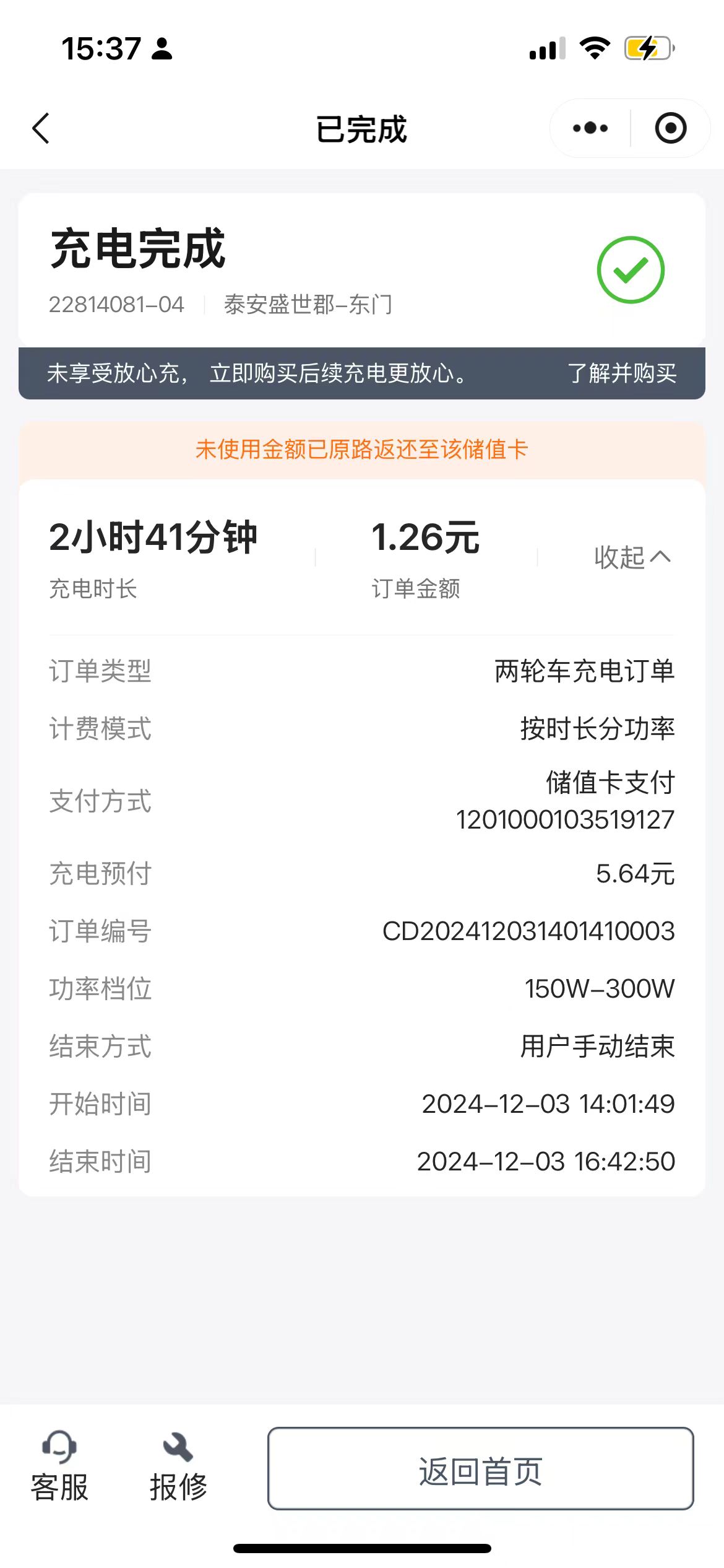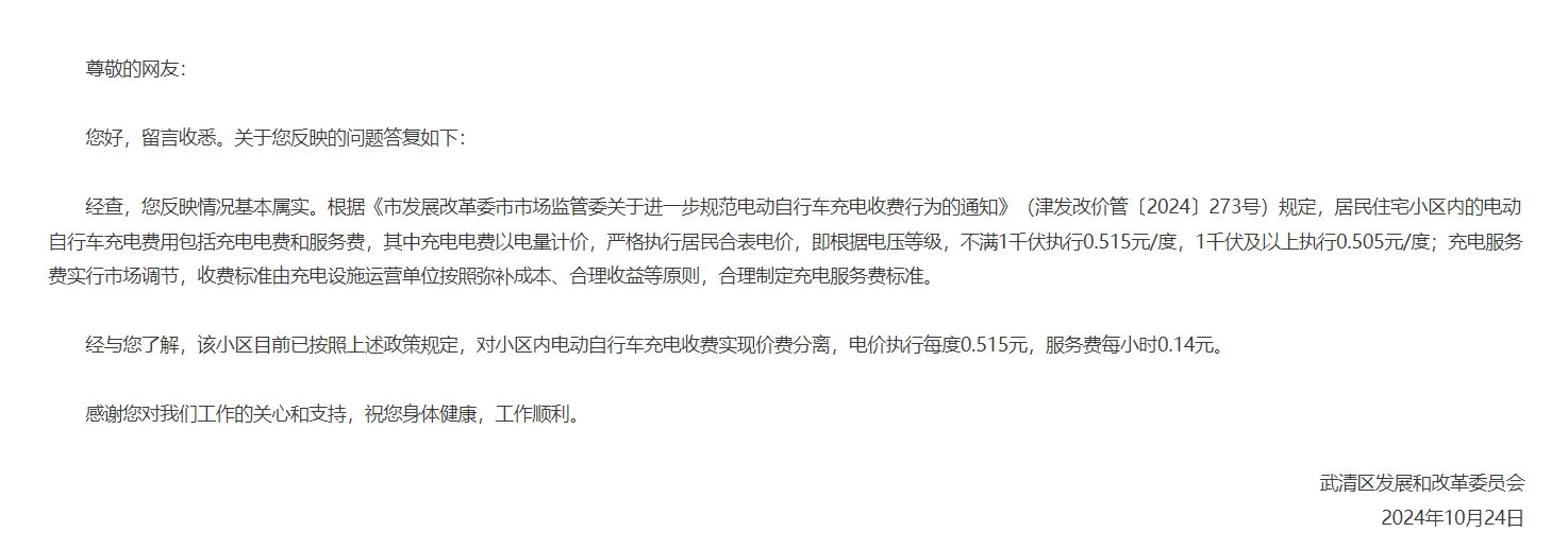 本人一辆爱玛电动自行车48V20A,使用小区安装的“云峰电气鼠”300W档位充电2小时41分被收费1.26元,2小时35分被收费1.21元,该收费标准较其他区(同型号电池武清区充电5小时收费0.9元)高2.7倍。电动自行车不允许上楼,居民积极配合,但如此收费给居民大幅增加了生活成本。