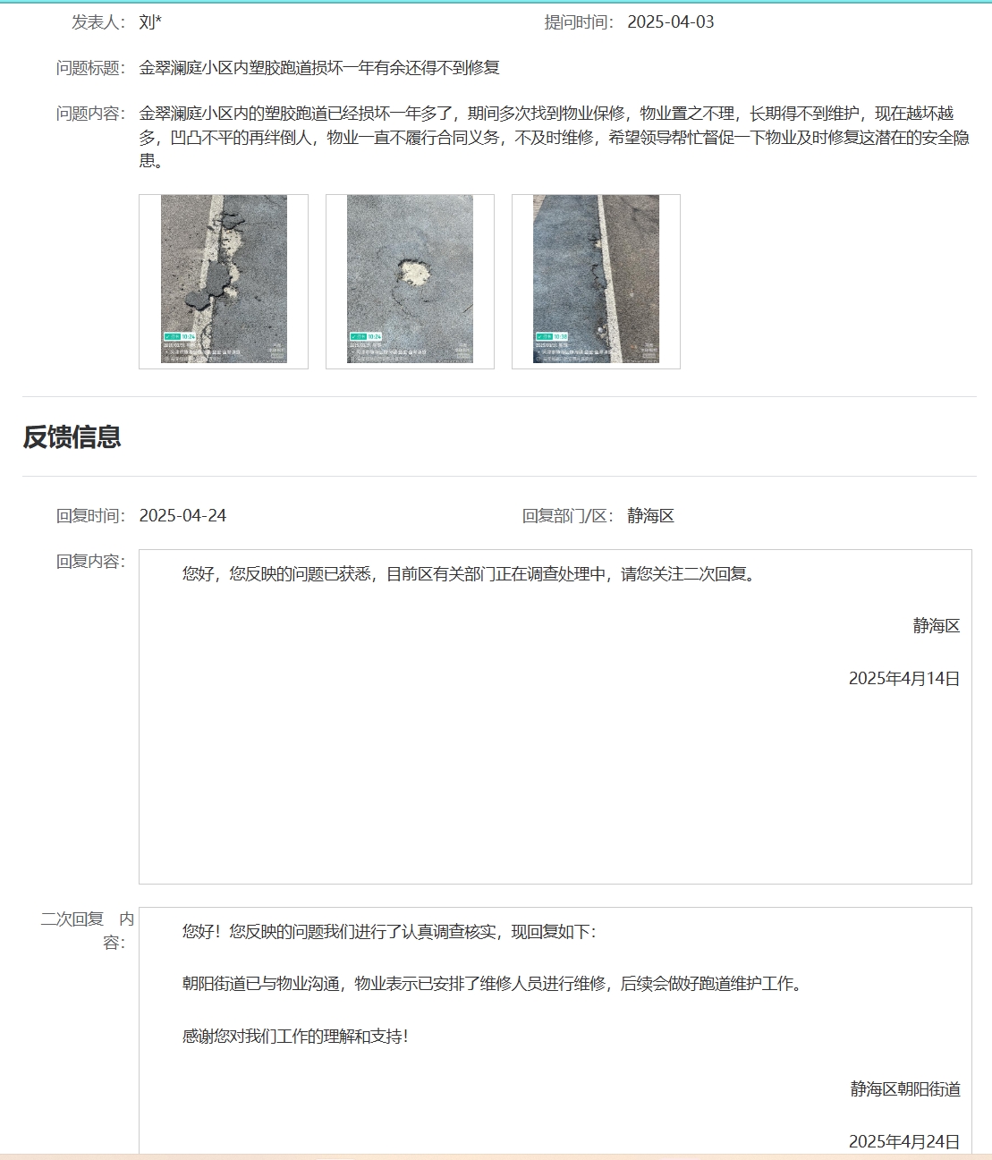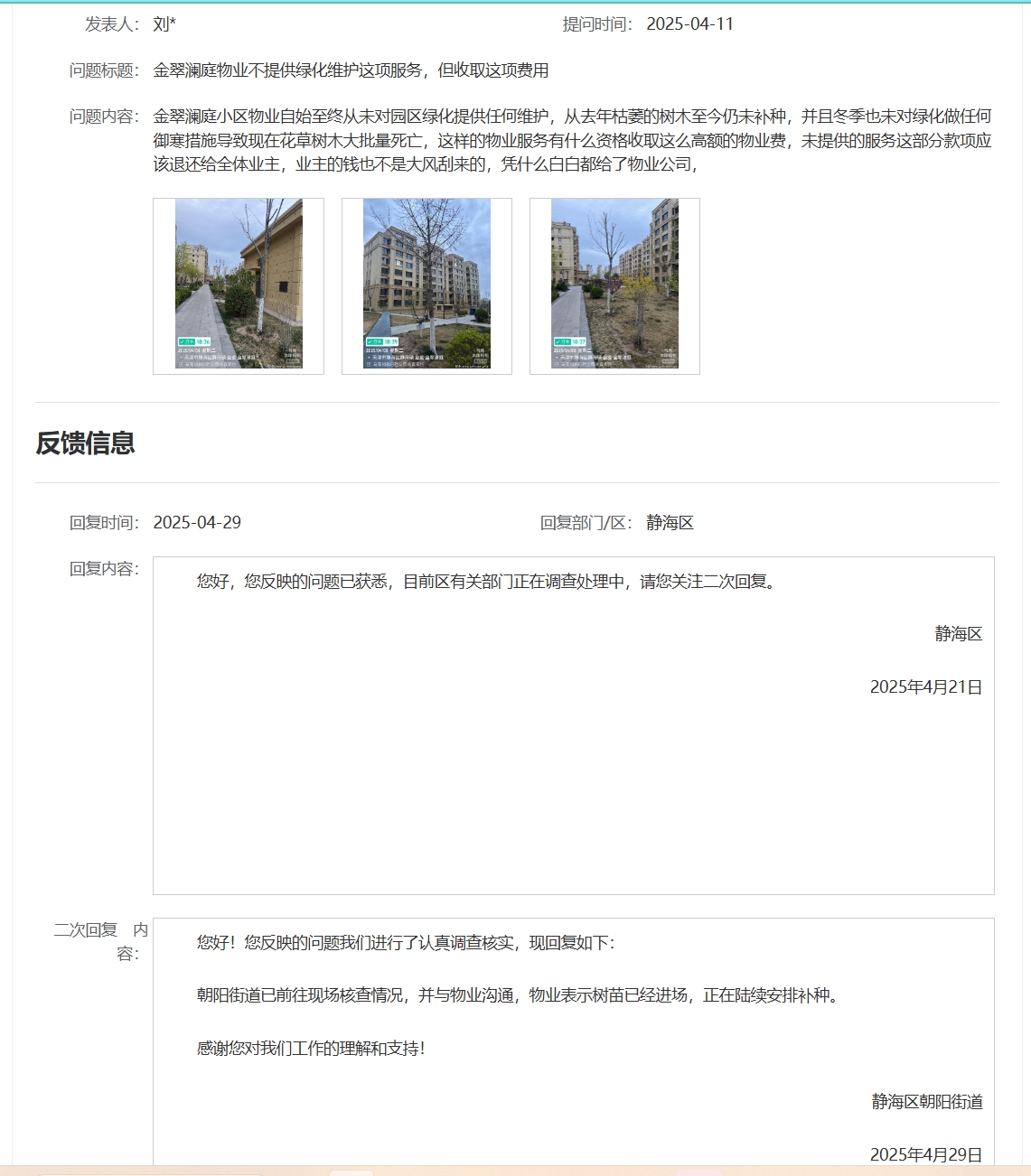 金翠澜庭小区内长期有大量流浪狗聚集,居民们多次和物业反应,物业一点措施也不采取,这流浪狗也没有定期打疫苗,身上都是病毒,咬到人怎么办,小区内这么多小孩,多危险一件事,物业一点不当回事,