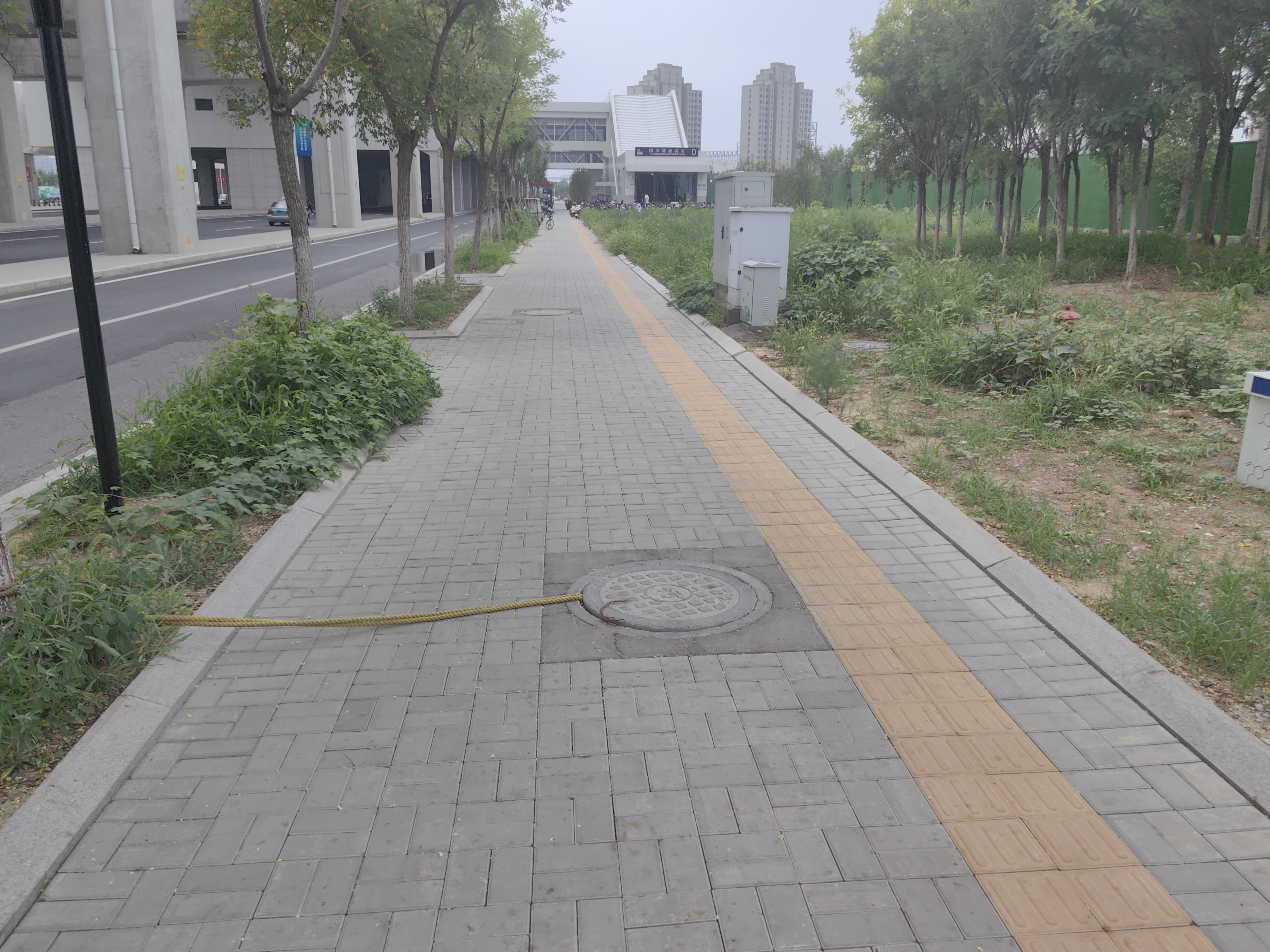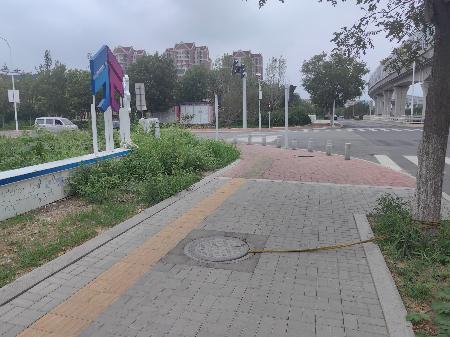不知此处绳索是不是为了方便开启井盖使用?绳索阻拦人行道一半宽度,给来往行人行走造成安全风险,容易被绊倒。