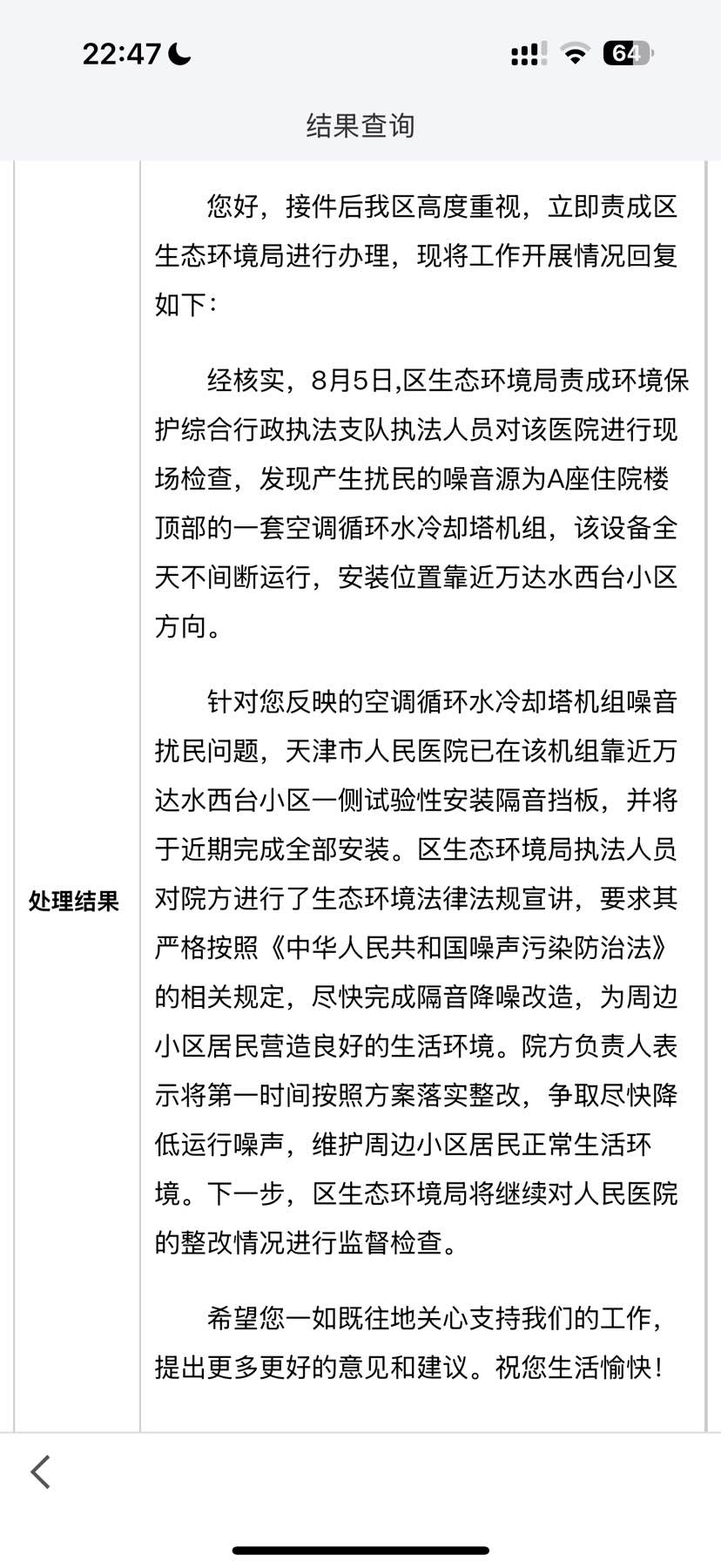 2025年9月24日,我院工作人员与您进行沟通,针对您反映的事项,与您进行充分沟通,我院自接到噪声扰民投诉以来一直在采取措施解决噪声问题,1.更换设备一组(正在进行测试)2.增设隔音罩(效果不显著)3.增设隔音墙(正在进行测试、安全论证),争取下一个制冷季前解决噪声问题。 感谢您对卫生健康工作的关心和支持,祝身体健康、工作顺利。