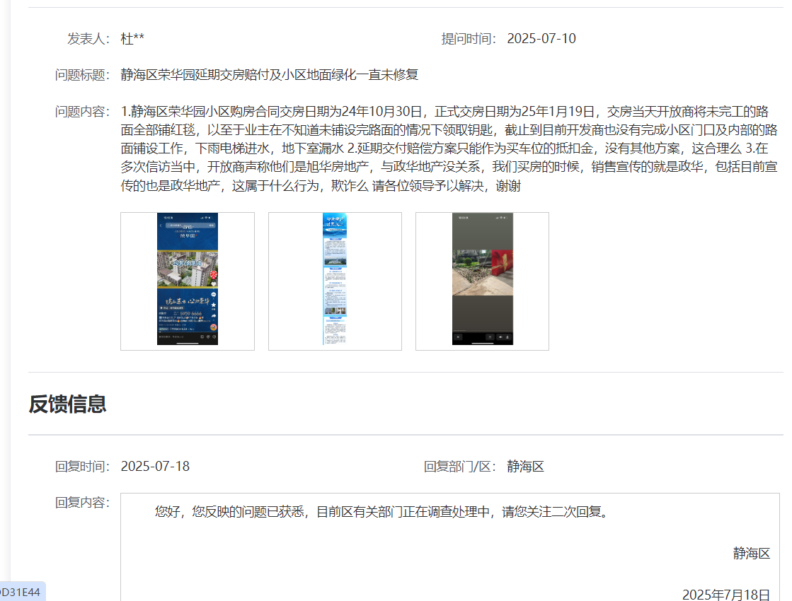 静海区荣华园延期交房赔付及小区地面绿化一直未修复
