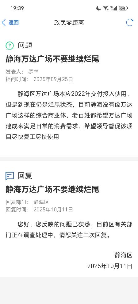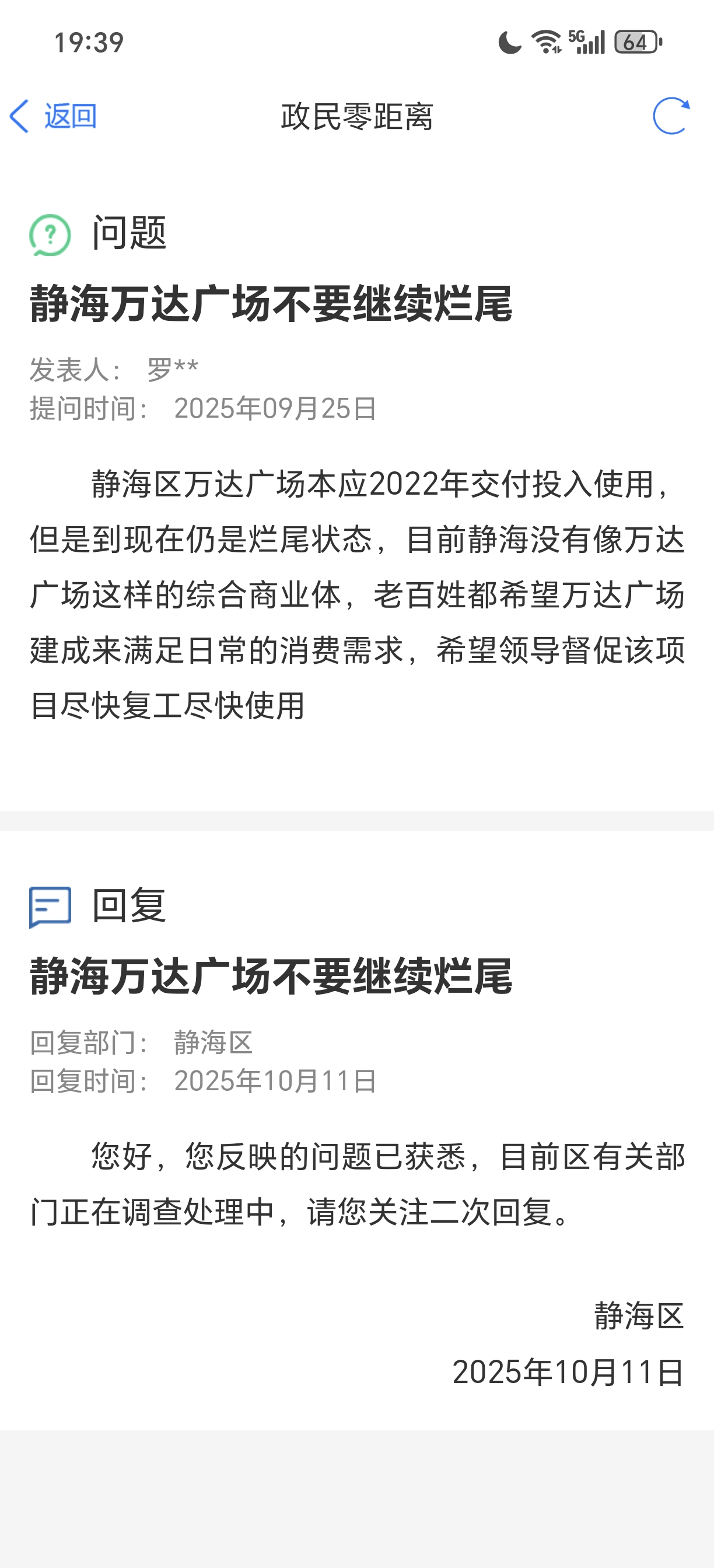 9月25日留言问题,10月11日仅回复关注二次回复,至今未收到二次回复的任何消息,回复消息的部门有点糊弄老百姓糊弄市领导了