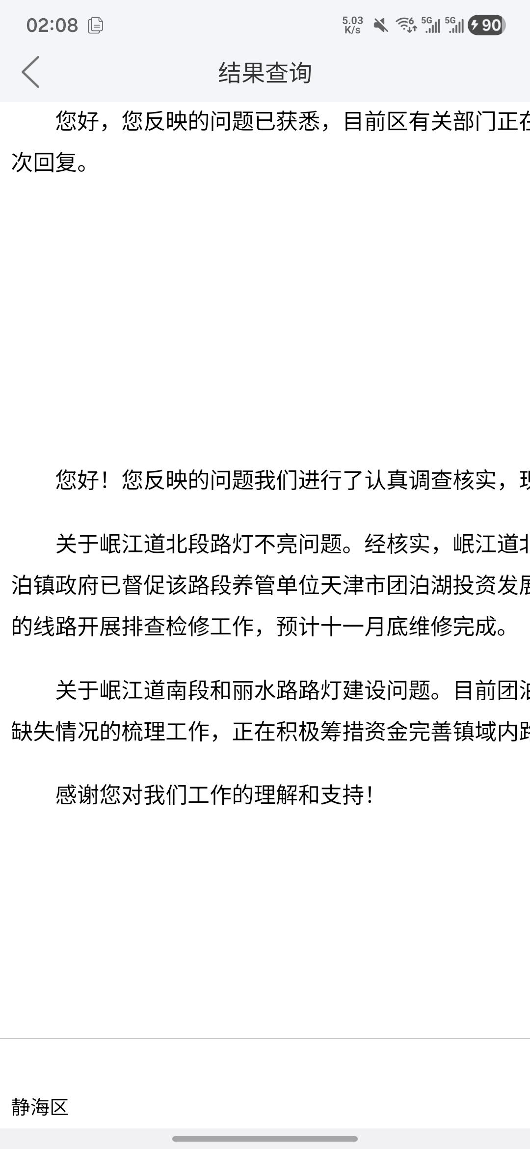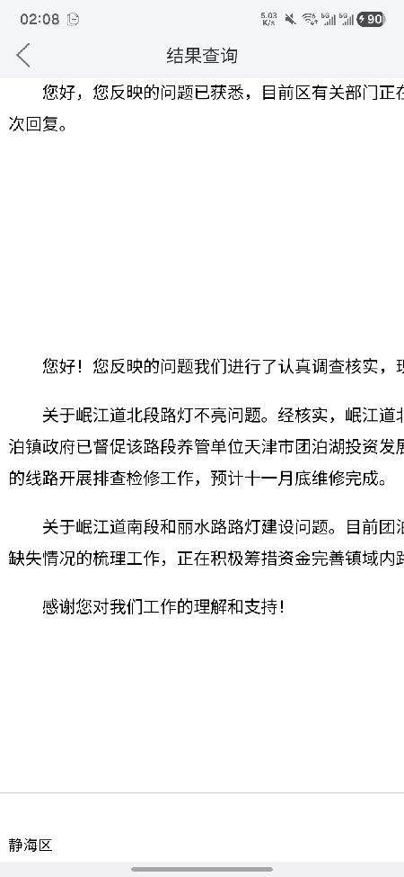 团泊政府回复的说11月底全部维修完毕,(下附回复内容)这都12底呀,路灯还是不亮!说了不做!!