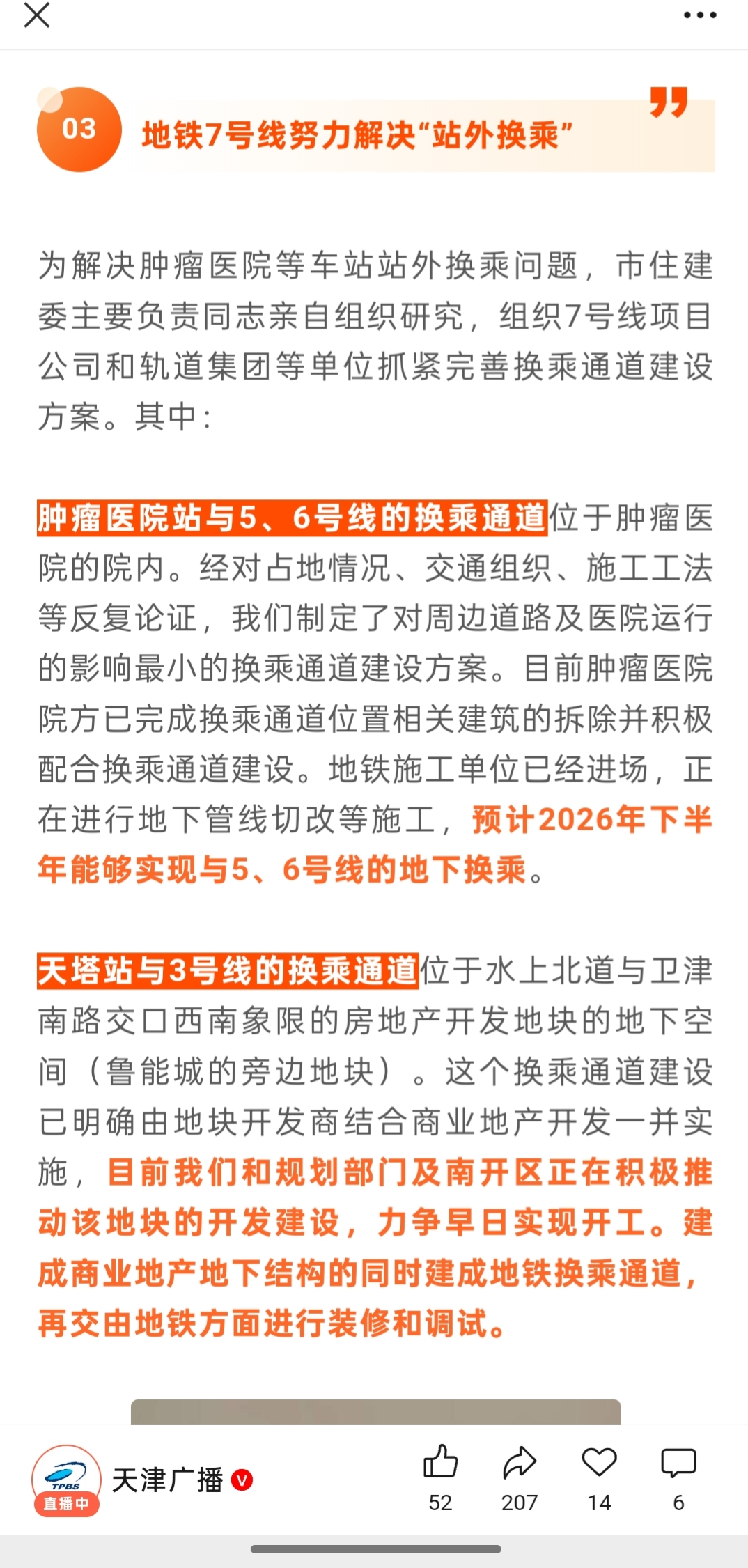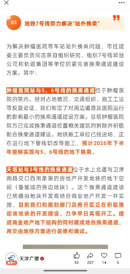 在今天,天津新闻广播推出的特别策划节目《2025委办局长访谈——市住建委专场》中,里面对解决7号线车站站外换乘的问题,做了单独说明。但本人注意到这次节目中只提到了肿瘤医院和天塔两站,没有提及海光寺站的问题。请问海光寺站的地下换乘通道建设前期工作进展如何?还是因为该站换乘通道建设难度过大,可能暂时搁置,所以没有该节目中提到?