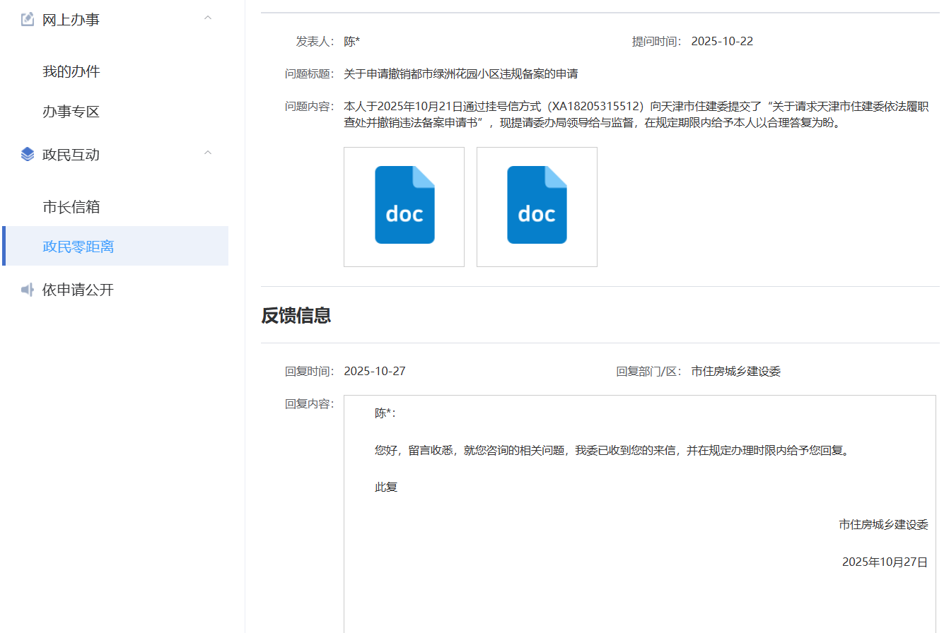 天津市住房和城乡建设委员会:本人此前于2025年10月21日通过挂号信(XA18205315512)提交了“关于请求贵委依法履职查处并撤销违法备案申请书”,并于10月22日在政民零距离平台留言咨询。贵委于10月27日回复称“已收到来信,并在规定办理时限内给予回复”。现特向贵委催促:目前距离贵委收到挂号信已过去68天,仍未收到贵委履职答复,已超出法定60天回复期限。请明确向本人出具该履职申请书面答复函的具体时间,以便我进行下一步司法程序。此致