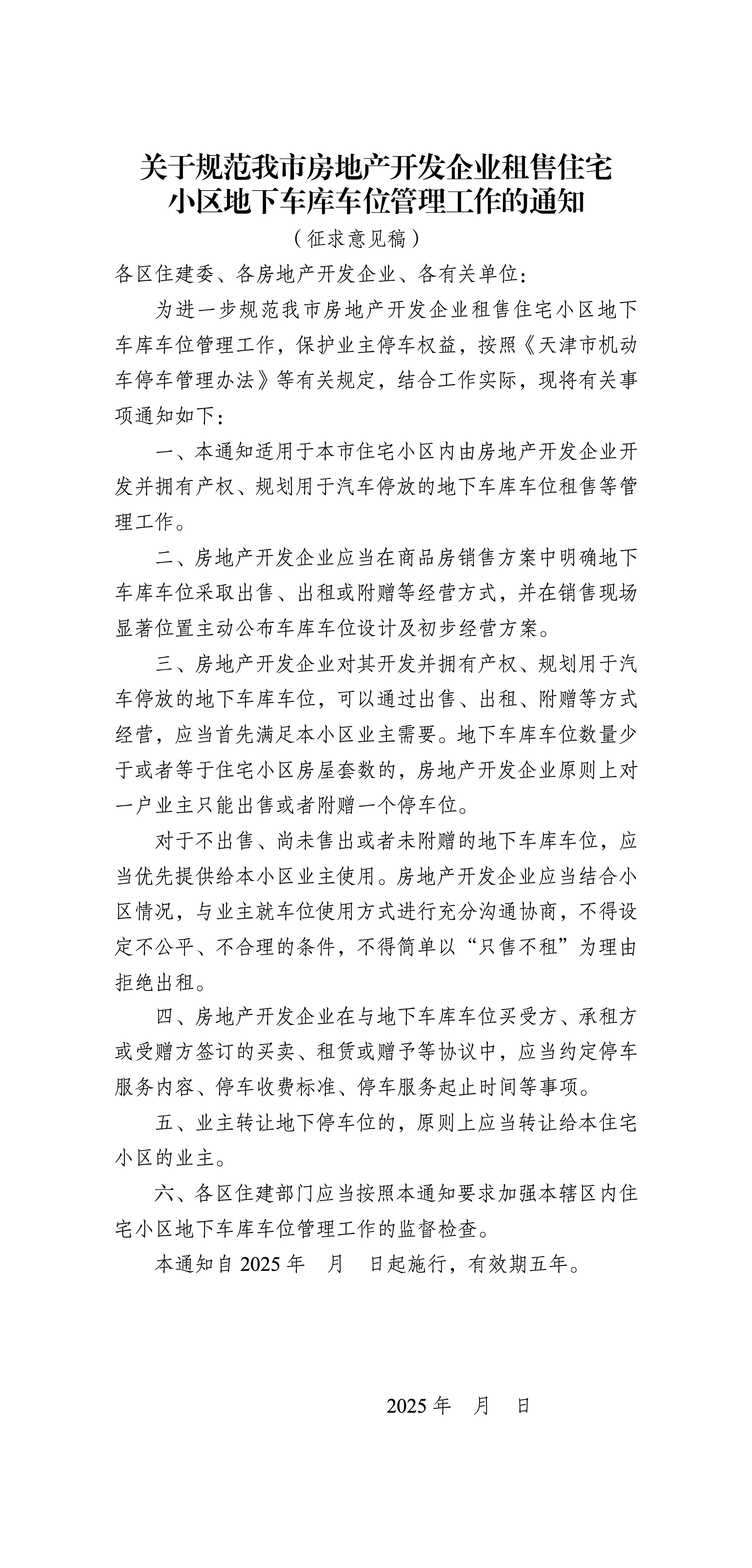 我留意到贵部门于 2025 年 4 月 30 日发布了《关于规范我市房地产开发企业租售住宅小区地下车库车位管理工作的通知(征求意见稿)》,该征求意见稿针对住宅小区地下车库车位租售管理提出了诸多规范和要求,这对于广大业主停车权益的保护以及地下停车资源的合理利用意义重大,让大家看到了政府对民生问题的重视和积极作为。