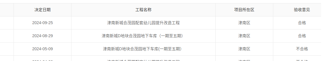 领导好,我是津南区新城合茂园的居民,近期我小区反应地库交付及收费的问题,相信我市12345热线和市、区住建委均已了解。我在官网查询该小区地库消防于2024年8月29日验收,此前2024年5月29日不合格,间隔三个月就能验收合格我持有怀疑,并且根据我在小区居住多年的观察,该小区在2025年照样还有消防栓破损等消防问题,不知道是怎么验收合格的,请予以回应。此为第一个问题。
