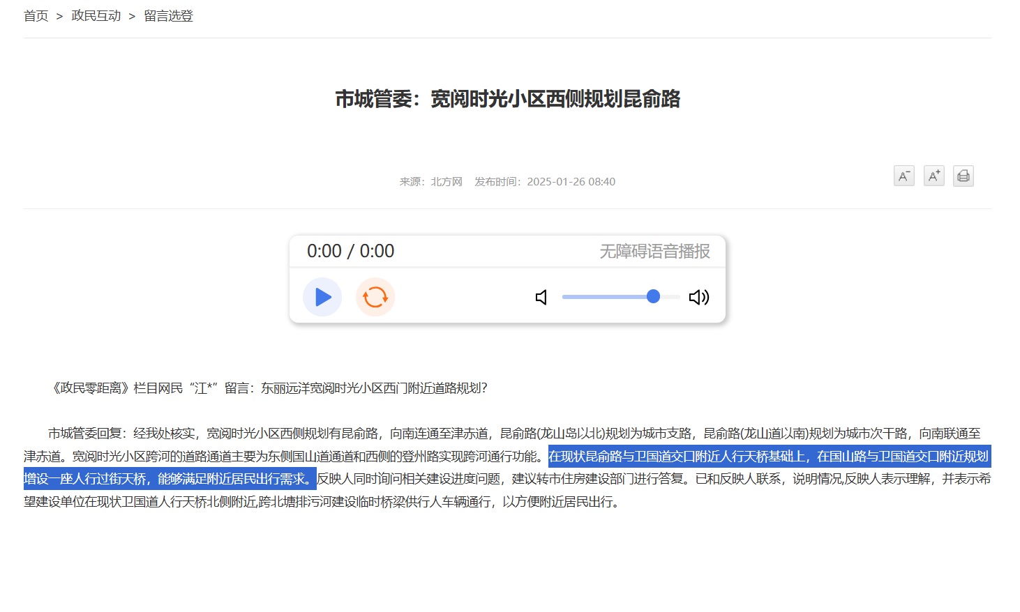 您好,留言收悉,就您咨询的相关问题,依据2024年市城市管理委发布的《天津市城市道路人行过街设施专项规划》,“国山路地铁站跨卫国道”天桥未列入近期重点建设任务。按照属地管理原则,下一步我委将指导东丽区结合周边土地性质及权属等情况,对该天桥进行必要性、可行性和经济性论证;如确需建设且具备建设条件,我委将区政府所提项目需求商请市发展改革委将其纳入市级政府投资三年滚动计划草案,经市人民政府批准后,结合市财政局确定的年度可出资规模,编制年度投资计划。